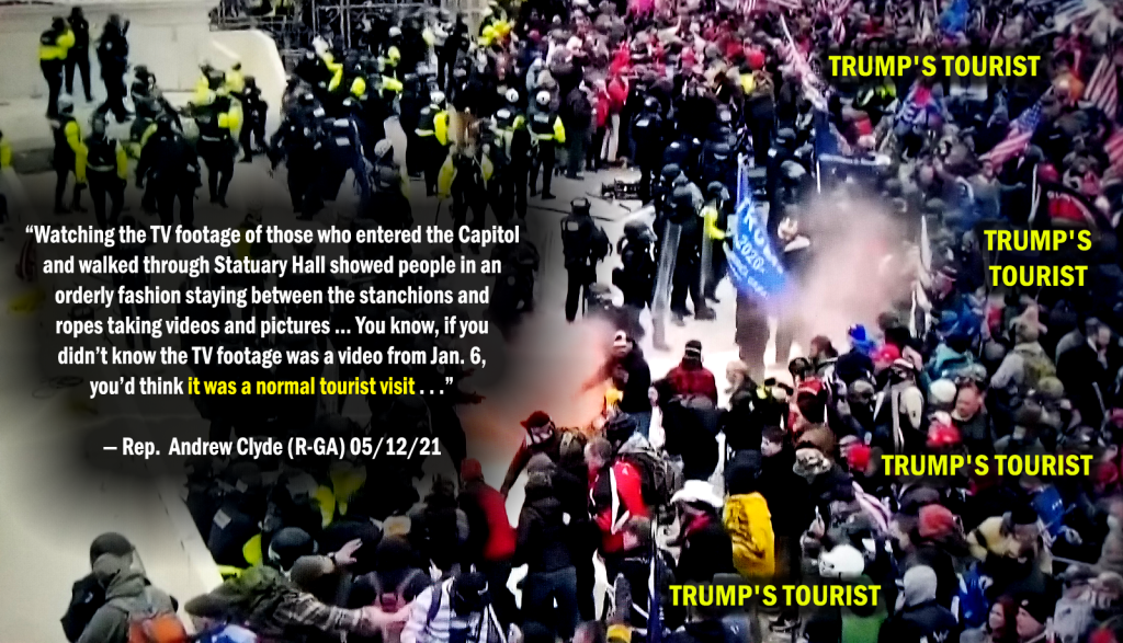 How insanely craven and in degenerate depraved behavior can anyone get? Republican Andrew Clyde is definitely speaking and lying to the low-info and gullible of Donald J. Trump’s Poorly Educated and delusional wackos in the Cult of Trump. And it is this sort of crazy talk that speaks to the support in and of the domestic terror attack on the U.S. Capitol, on Jan. 6 while Congress was in a Constitutional joint session. It is this opinion that threatens the country and it’s citizens in describing a treasonous insurrection in the most duplicitous manner imagined – unparalleled in the history of United States of America. Clyde, in the least needs to be voted out of office . . . and put in some mental institution.